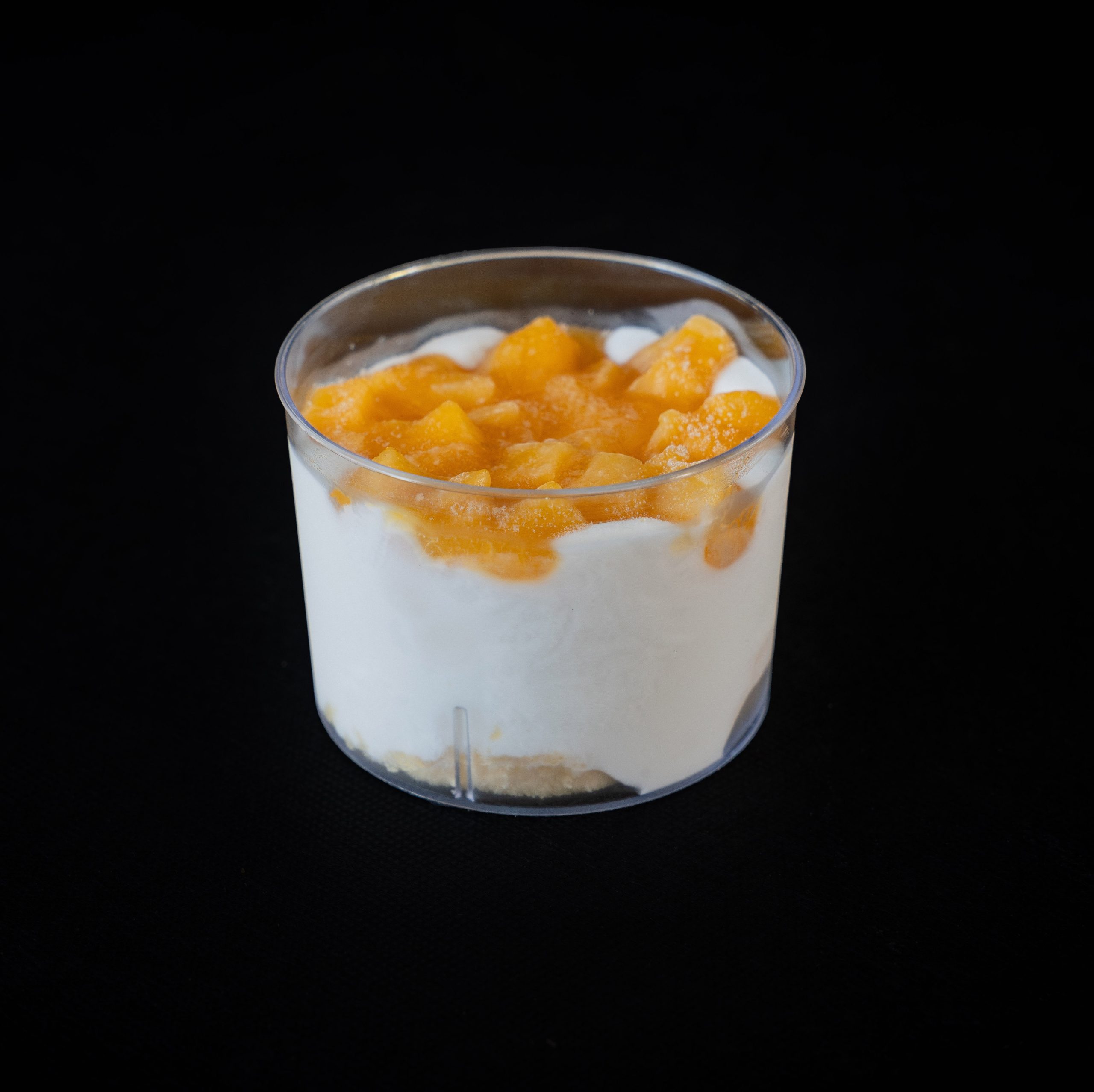 Mousse de yogurt con corazón de mango y maracuyá y acabado de mermelada de mango.